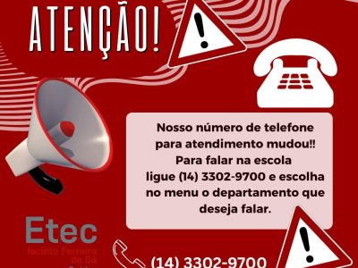 A Etec Jacinto Ferreira de Sá informa à comunidade escolar que houve alteração em seu número de telefone para atendimento.